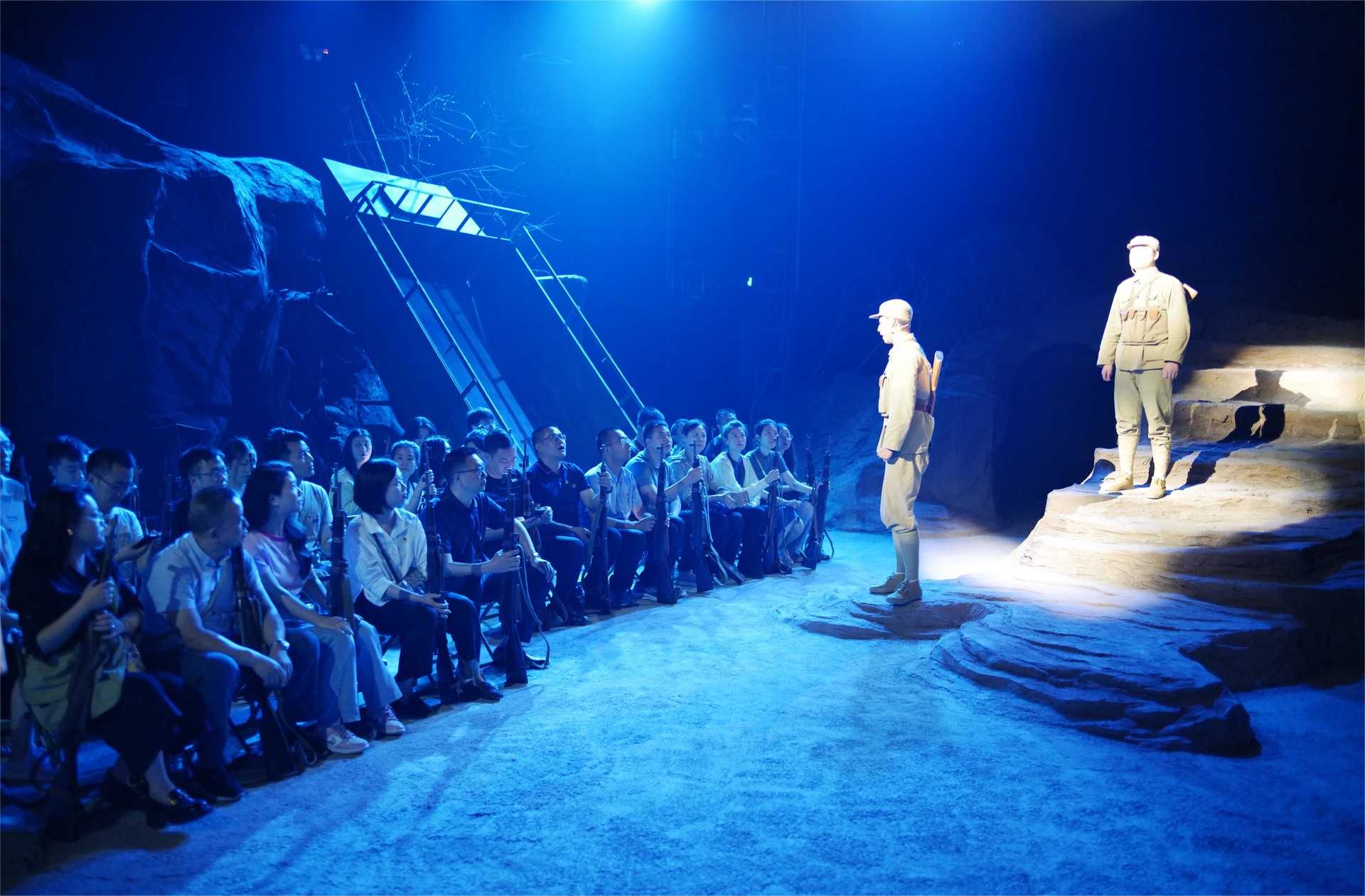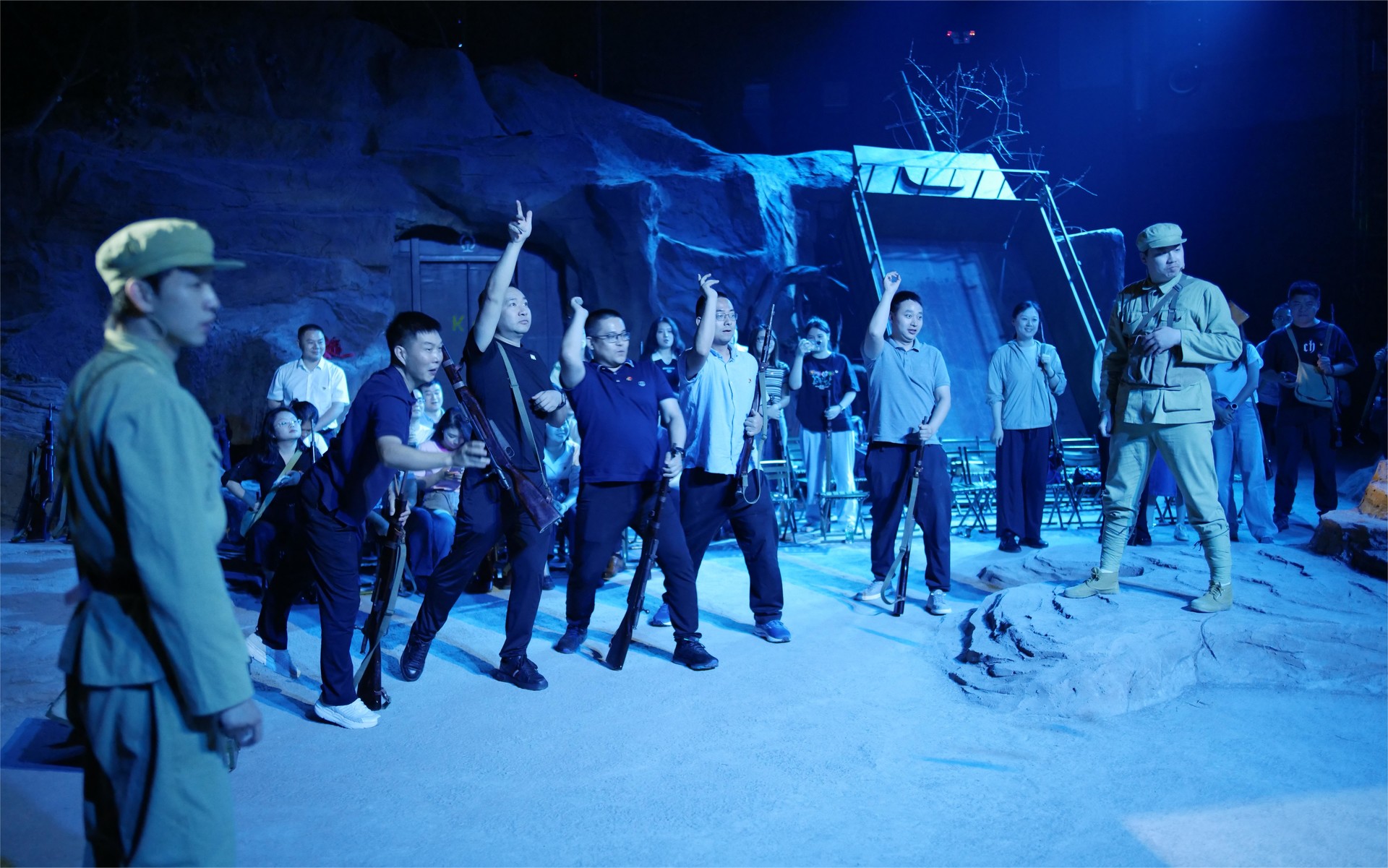 “同志們,你們準備好了嗎?”“準備好啦!”參觀完紅色文化長廊,大家整齊列隊進入沉浸式劇場,在充滿歷史感的環境中,駐足2024、回望1953。通過家鄉話別、寫家書、投擲手榴彈、坑道作戰、運送物資等環節沉浸式體驗硝煙彌漫的戰場,先輩們的英勇事跡在全息影像中得以生動還原,每一幀畫面都如同英雄的心跳,激發著黨員干部內心的無尚崇敬和愛國主義情懷。在虛擬與現實交融的舞臺上,大家觸摸歷史的脈搏,集體莊重許下弘揚偉大抗美援朝精神建設四川水網的莊嚴承諾。